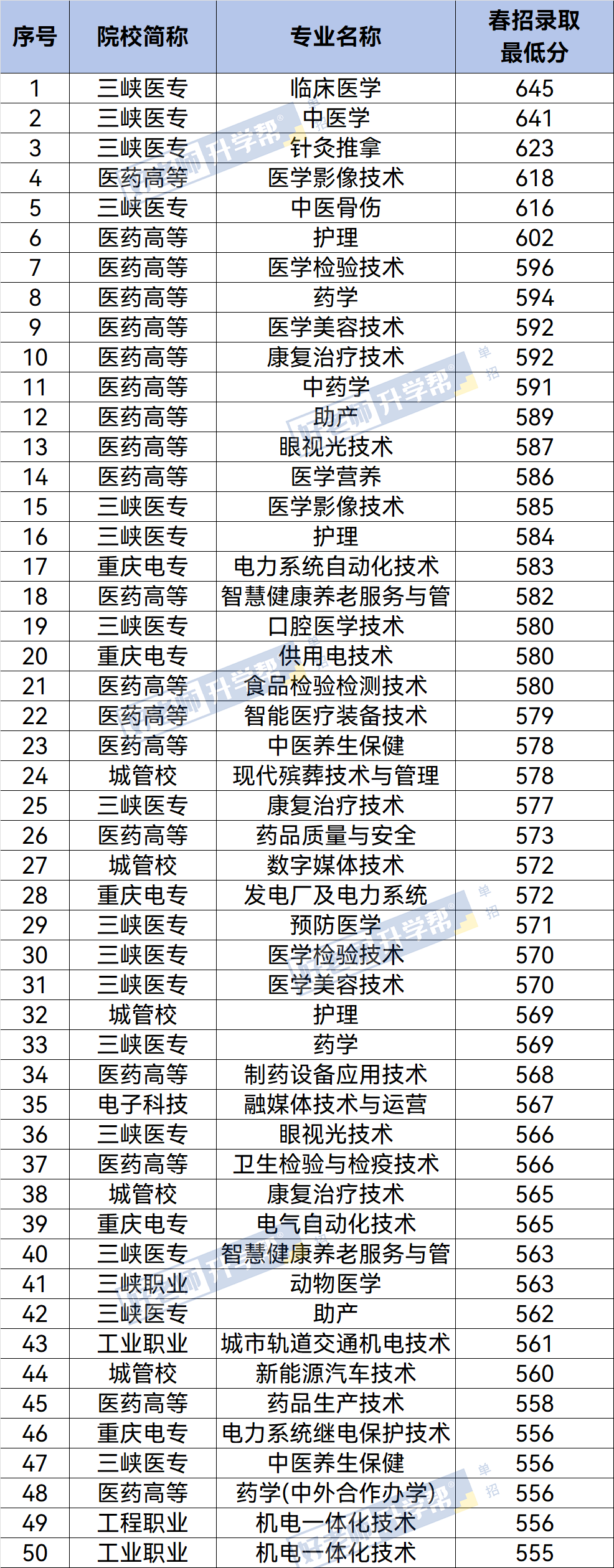 明年想要报考春季高考的重庆考生,来看看2025年考试排名前50的专业都是哪些?