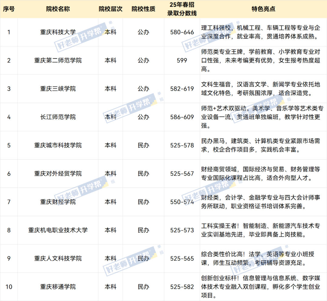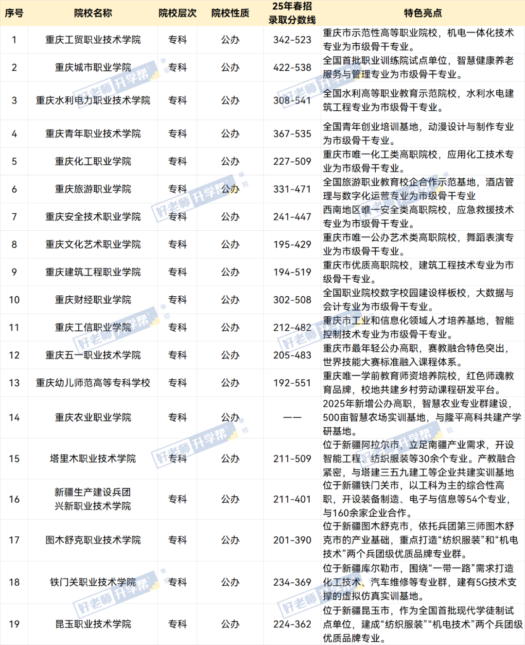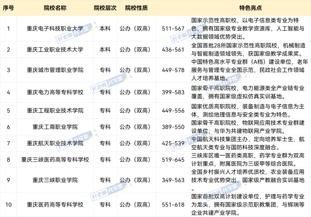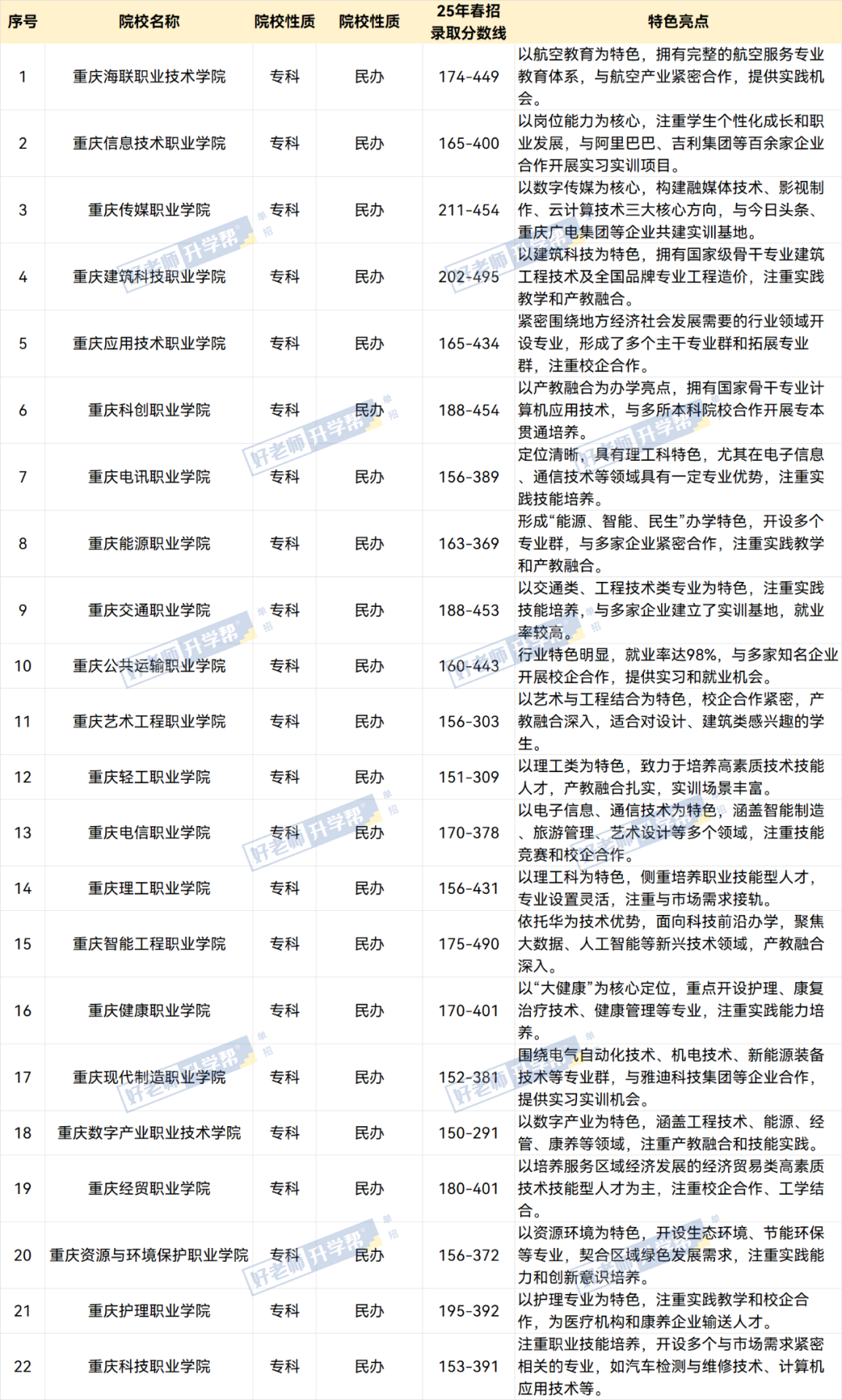 导读:重庆高职分类考试(又称“春招”)作为重庆考生升学的重要路径,覆盖本科与专科院校,涵盖专本贯通、双高计划、公办专科等热门类型。根据25年招生情况,今天小升学姐就来给大家盘点一下!