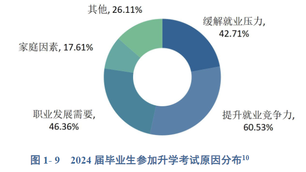 2024 届毕业生中,28.10%的毕业生参加过升学考试。毕业生参加升学考试的原因主要为提升就业竞争力、职业发展需要,占比依次为 60.53%、46.36%。